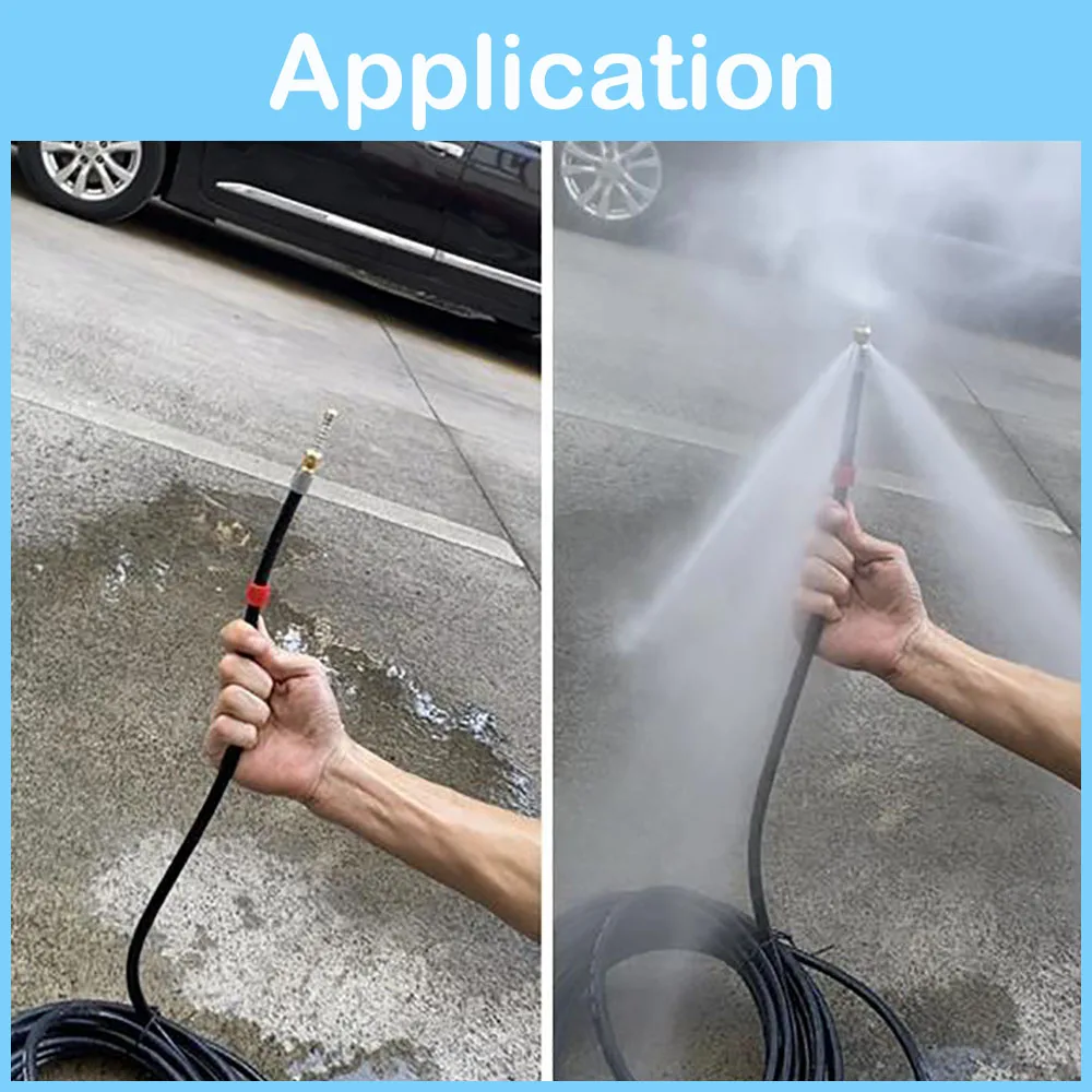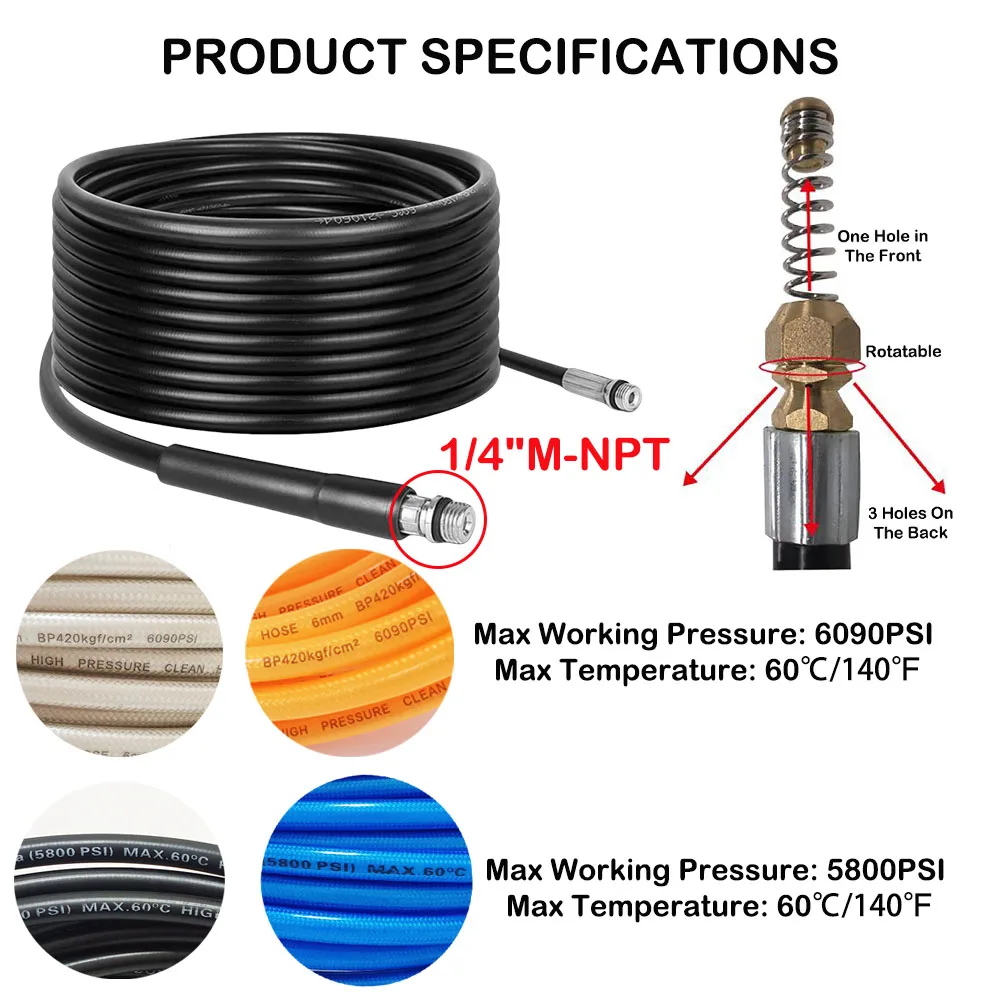 [ Professional Cleaning ] : 1/4” x 160bar sewer jetting hose, perfectly works with electric pressure washer for household application; The nozzle is designed to be small enough to clean in all of the tight spaces like drain pipes and sewer lines. It is easy to slide into sewer lines and drain pipes. It offers an even cleaning and flushes out debris.
