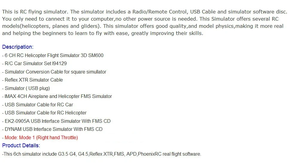 Flysky FS-SM600 RC SM600 simulator started 6 -channel flight simulator G4/G3.5 / Phoenix 2.5/XTR5.0 MODE1 (Right Hand Throttle)